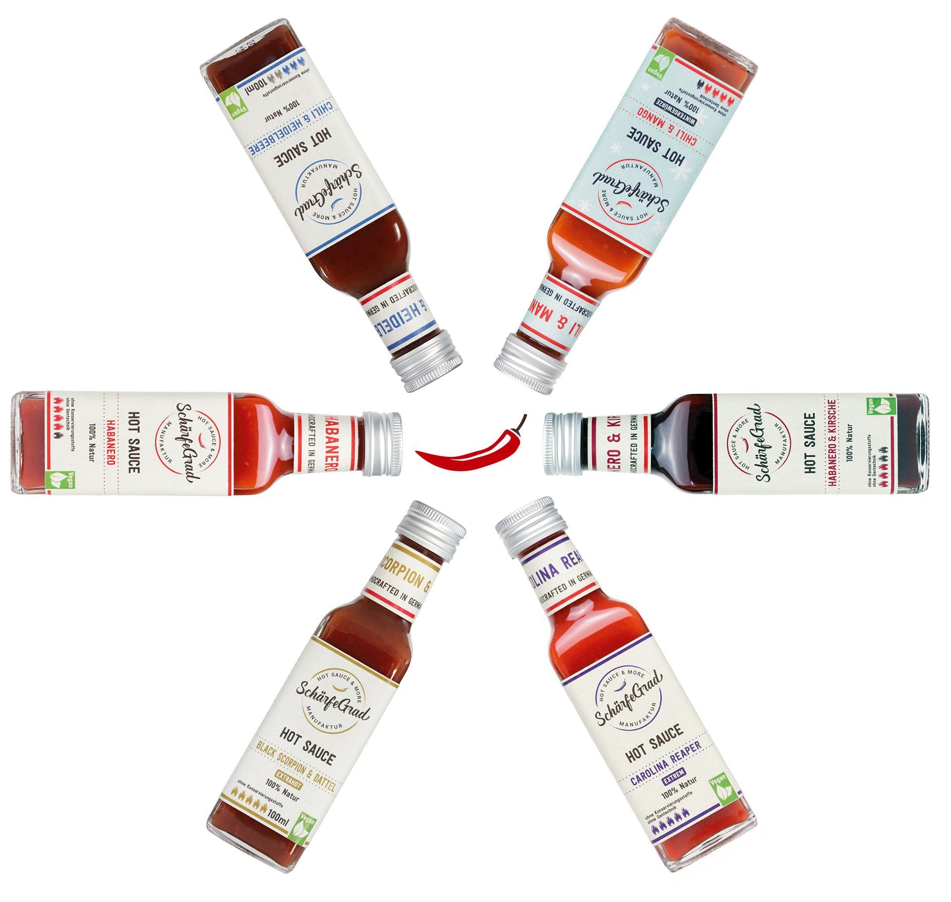 Jede einzelne Chili wird von uns in der Region liebevoll von Hand ausgesät, gezüchtet und geerntet. Wir legen Wert auf kurze Zutatenlisten und beste Qualität. Unsere feinen, aber sehr scharfen Hot Saucen beinhalten alles, was sie brauchen – nicht mehr, aber auch nicht weniger.